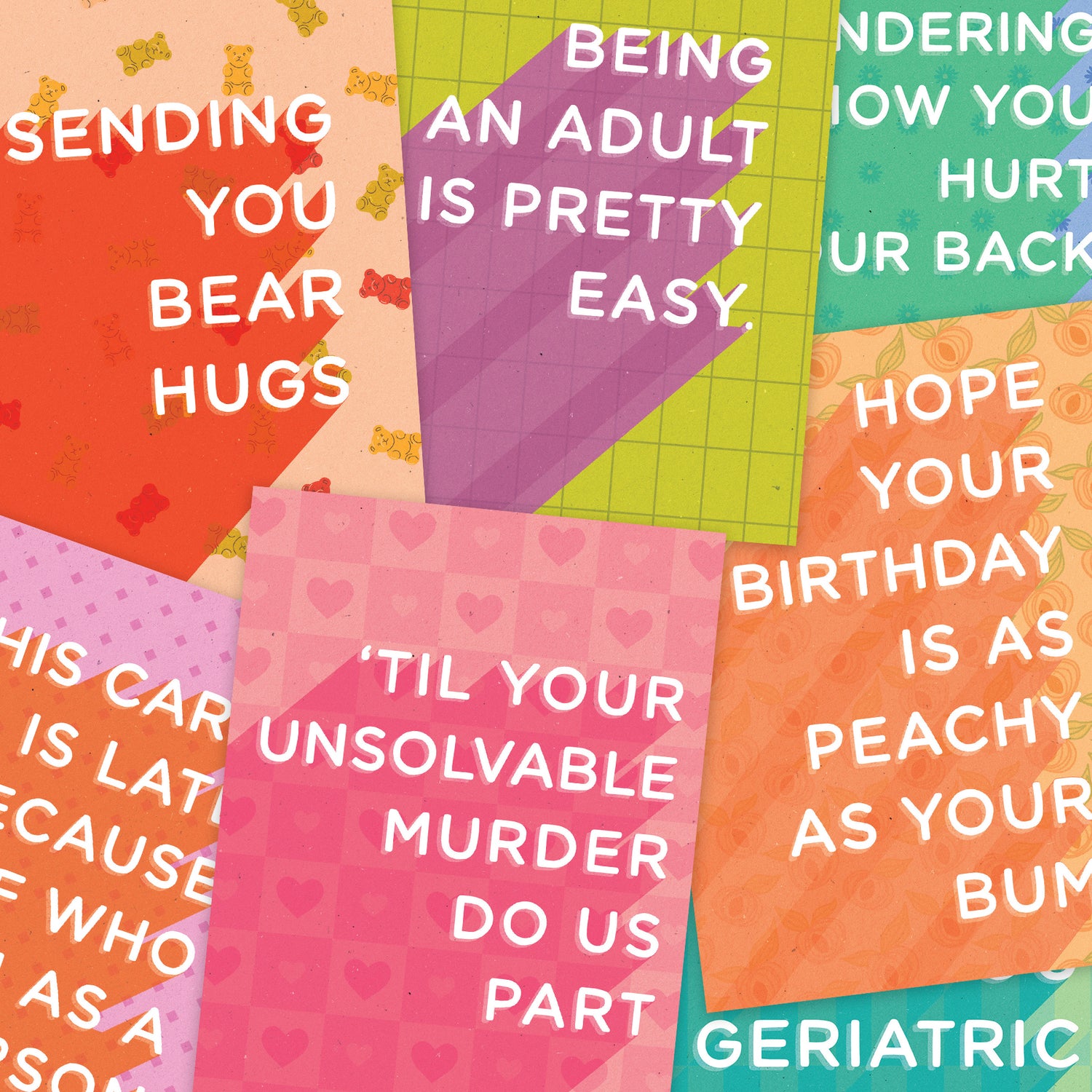 This bold and unapologetically hilarious card line delivers vibrant, full-colour designs inside & out, paired with humour that cuts through the fluff!
