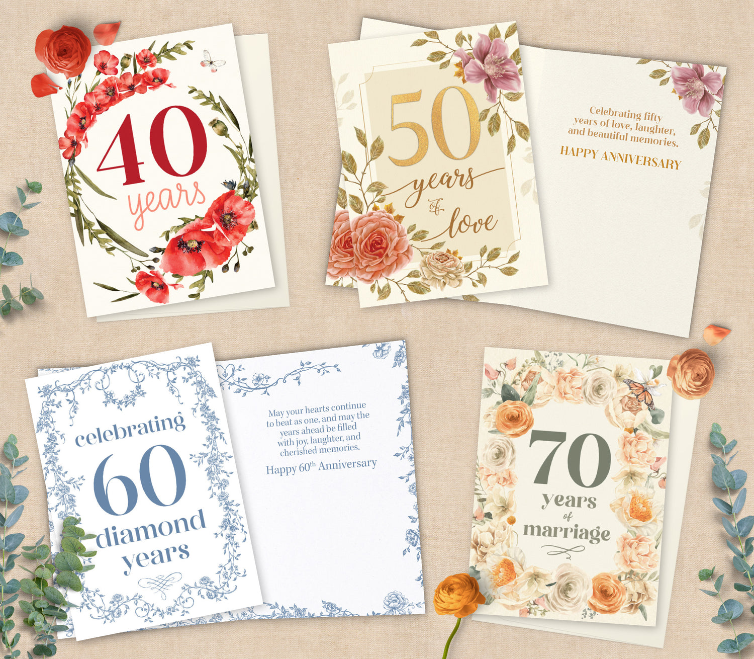 Each and every card in the Milestones line is printed in full colour inside and out, has a special high gloss spot coat treatment applied to the card fronts, and is paired with a coordinating colored envelope.