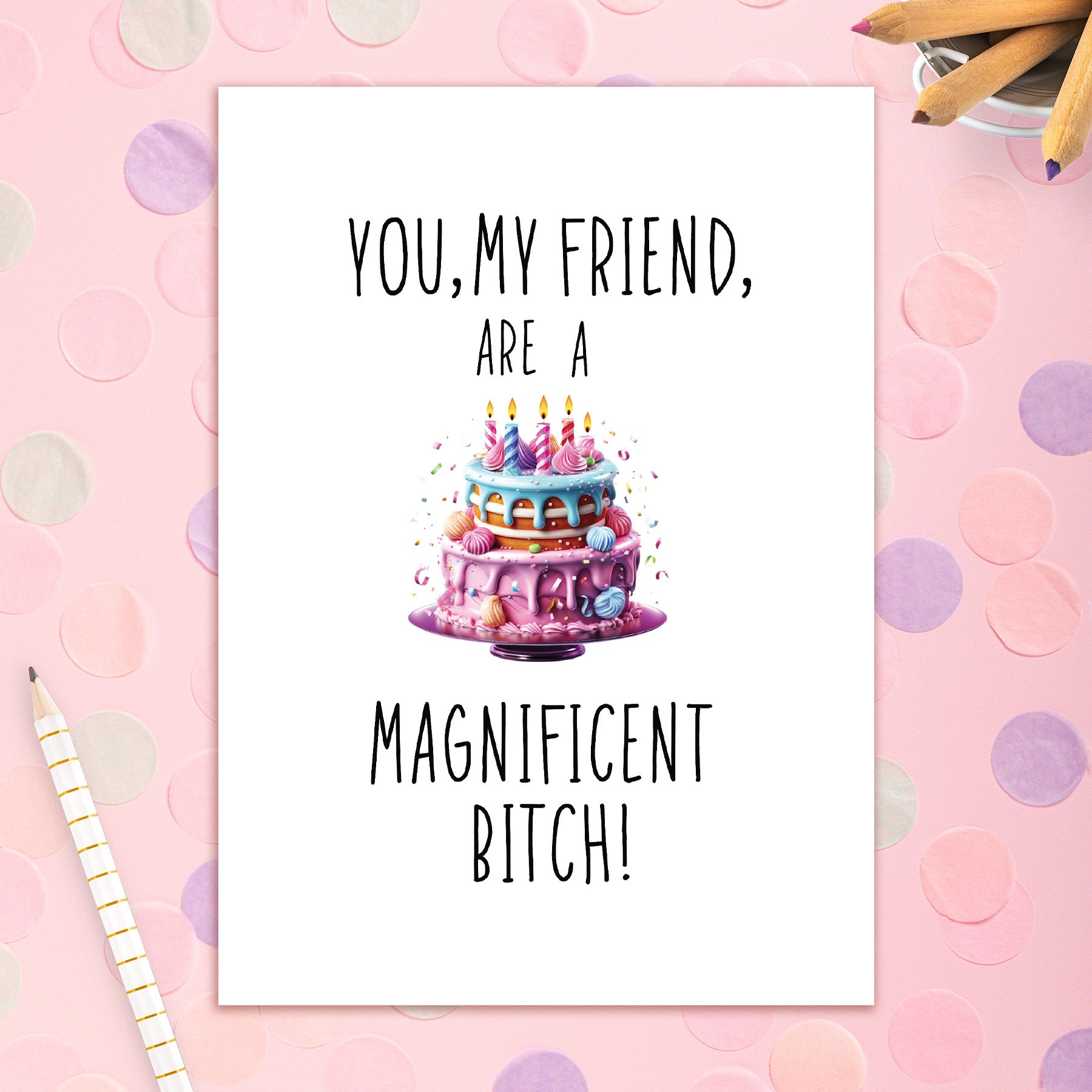 This greeting card measures 5 x 7 and comes with a coordinating colorful envelope.