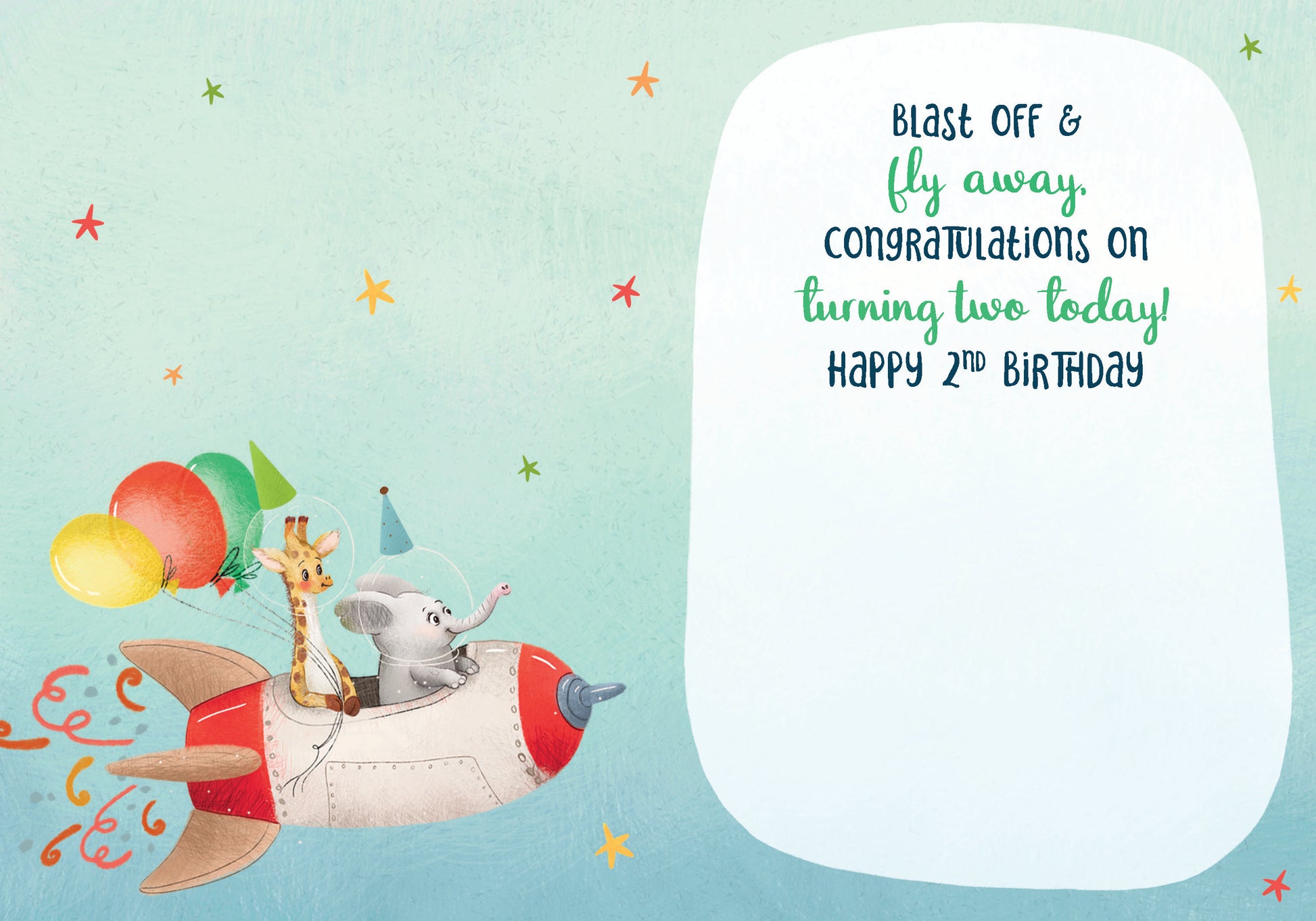 Inside Greeting: Blast off & fly away, congratulations on turning two today!