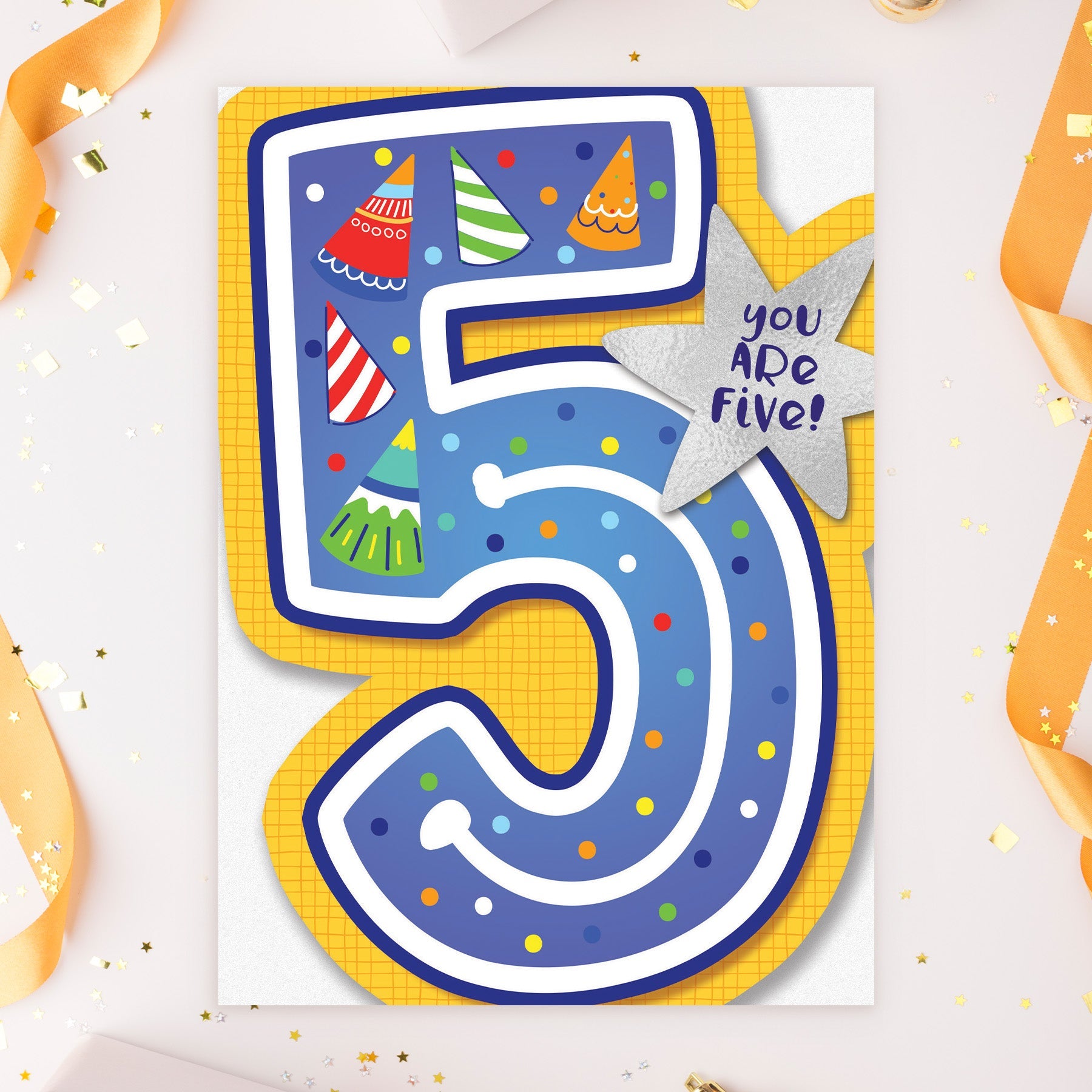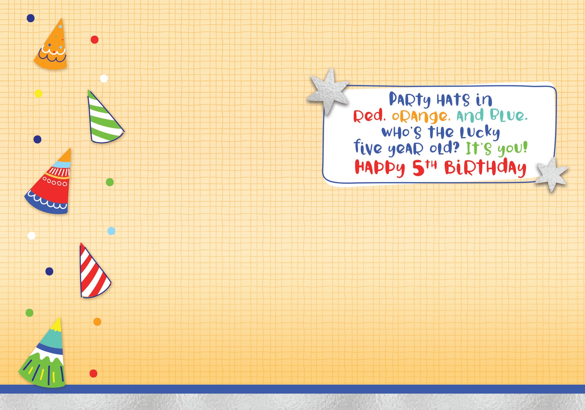 Inside Greeting: Party hats in red, orange, and blue. Who's the lucky five year old? It's you! Happy 5th Birthday.
