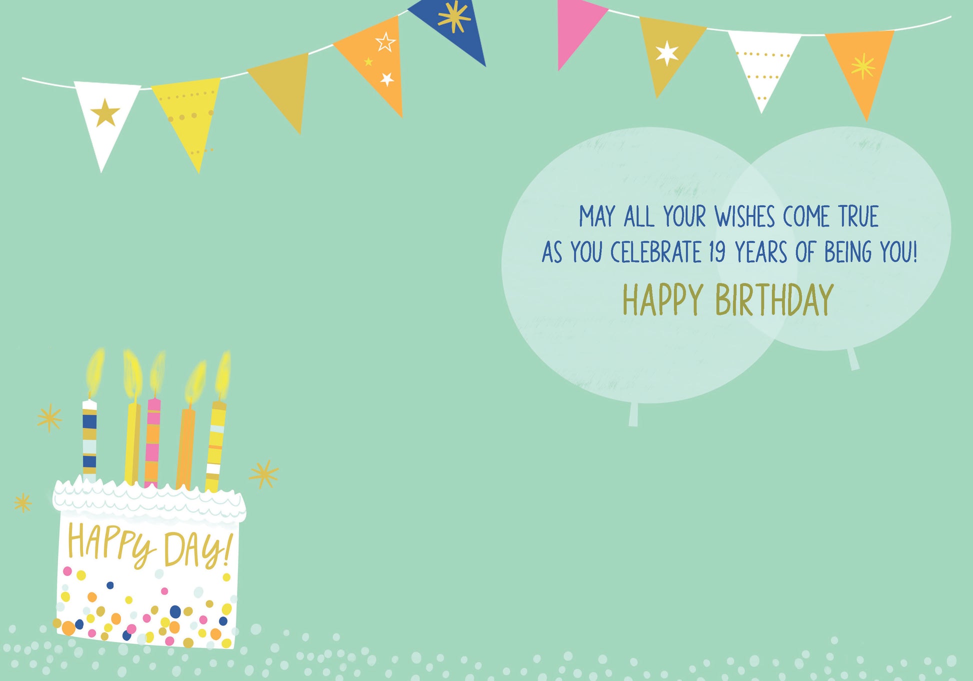 Inside Greeting: May all your wishes come true as you celebrate 19 years of being you! Happy Birthday.