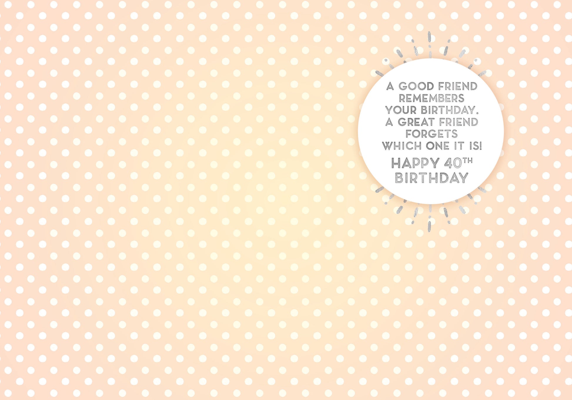 Inside Greeting: A good friend remembers your birthday. A great friend forgets which one it is! Happy 40th Birthday.