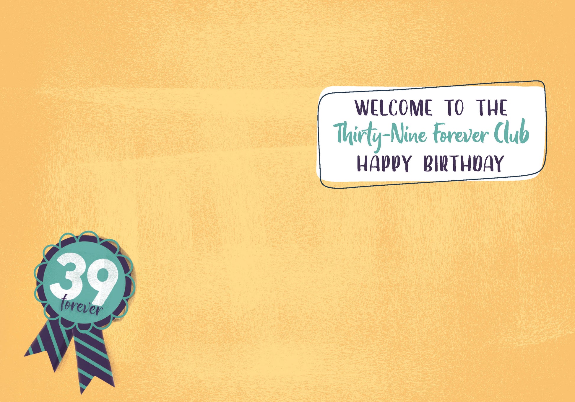 Inside Greeting: Welcome to the Thirty-Nine Forever Club. Happy Birthday.