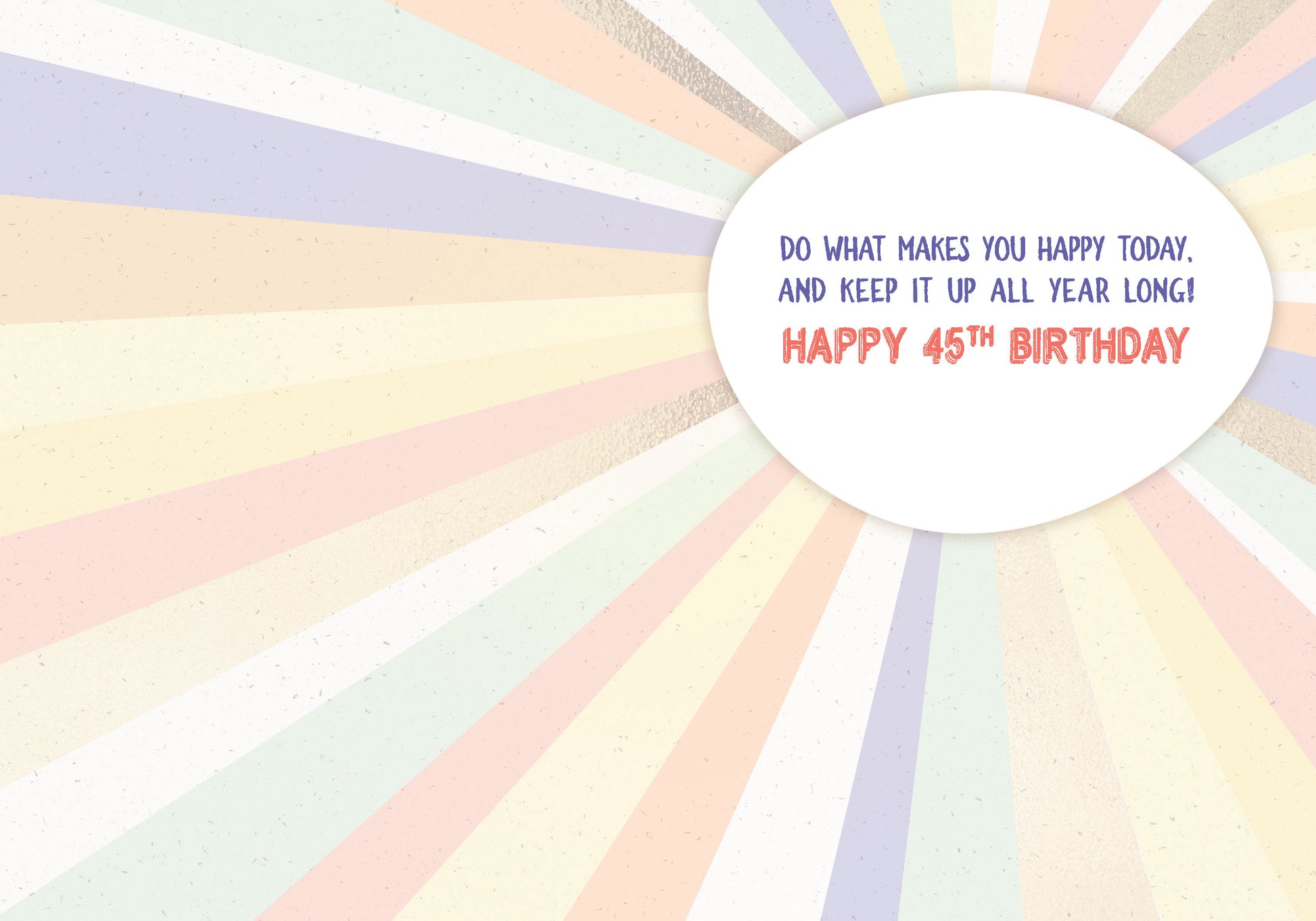 Inside Greeting: Do what makes you happy today, and keep it up all year long! Happy 45th Birthday.