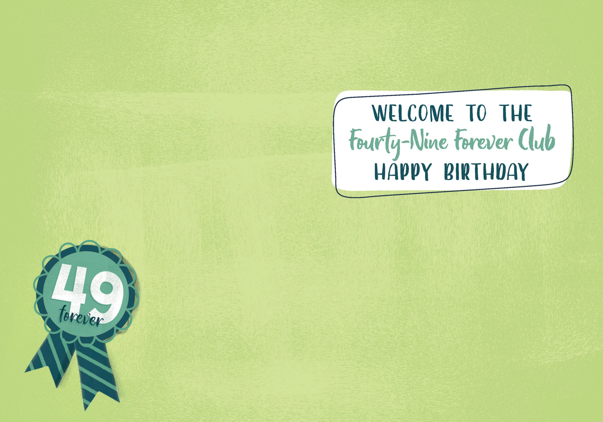 Inside Greeting: Welcome to the Forty-Nine Forever Club. Happy Birthday.