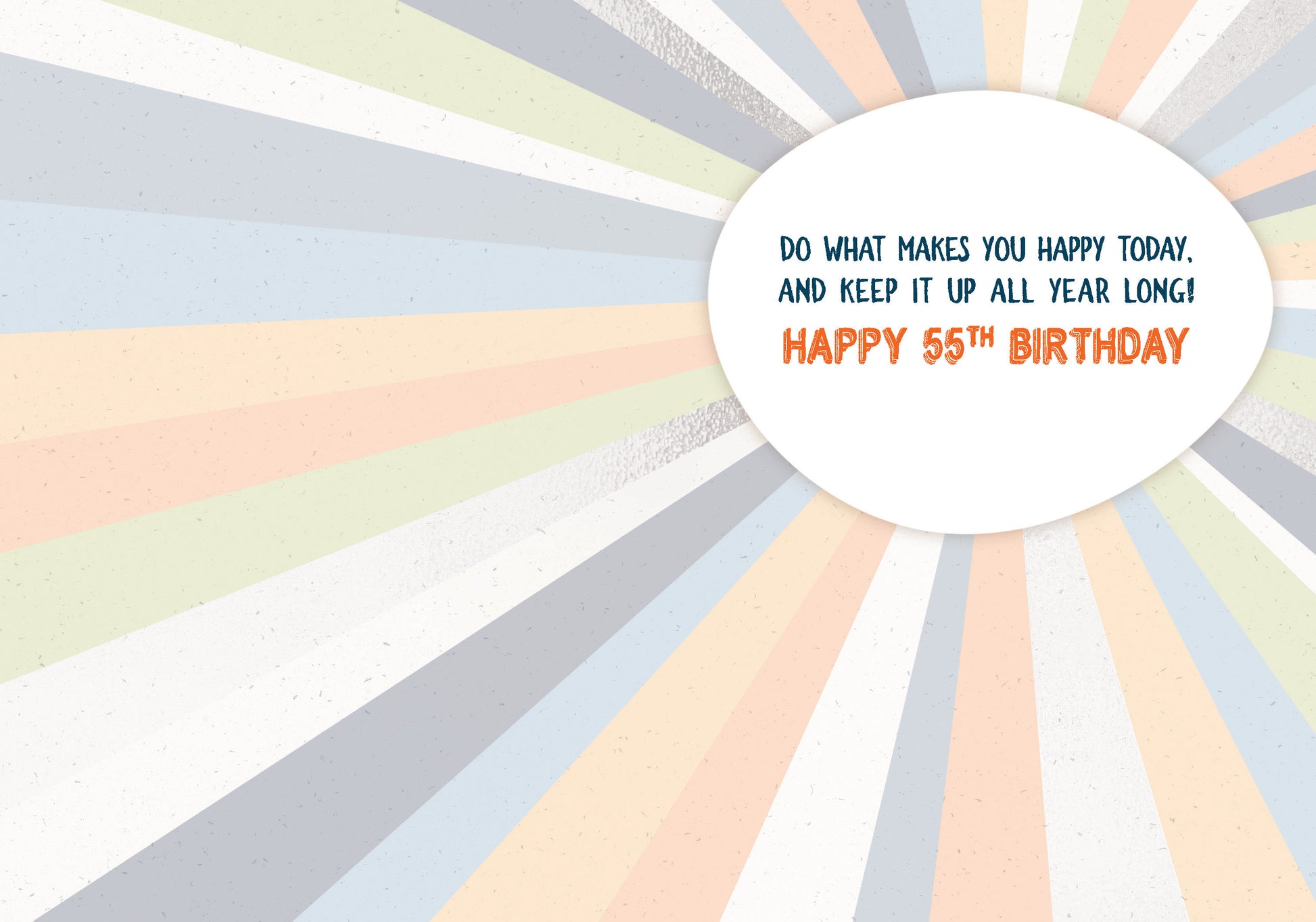 Inside Greeting: Do what makes you happy today, and keep it up all year long! Happy 55th Birthday.