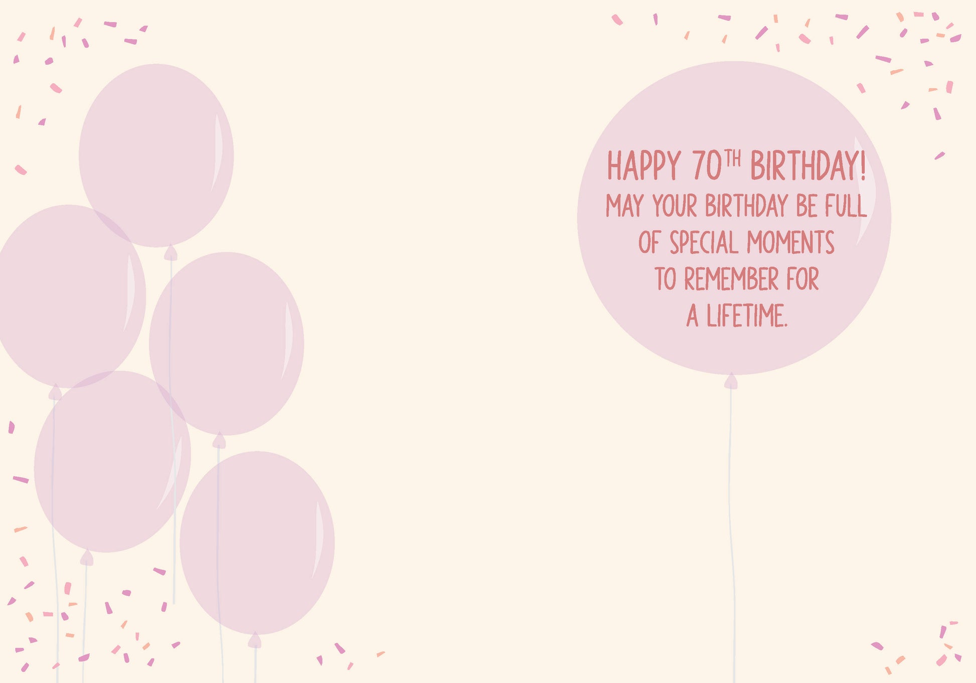 Inside Greeting: May your birthday be full of special moments to remember for a lifetime. Happy 70th Birthday.