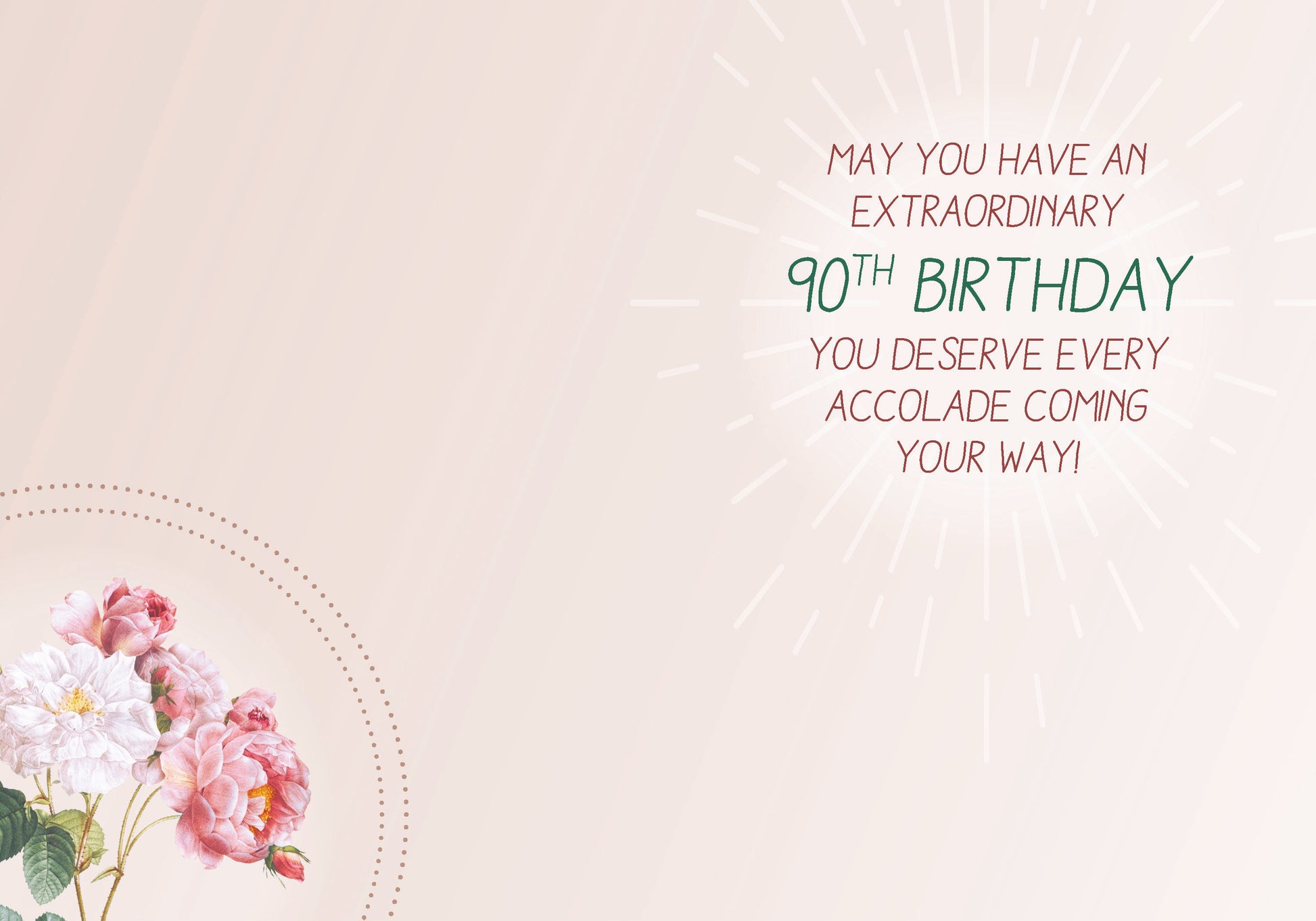 Inside Greeting: May you have an extraordinary 90th birthday. You deserve every accolade coming your way!
