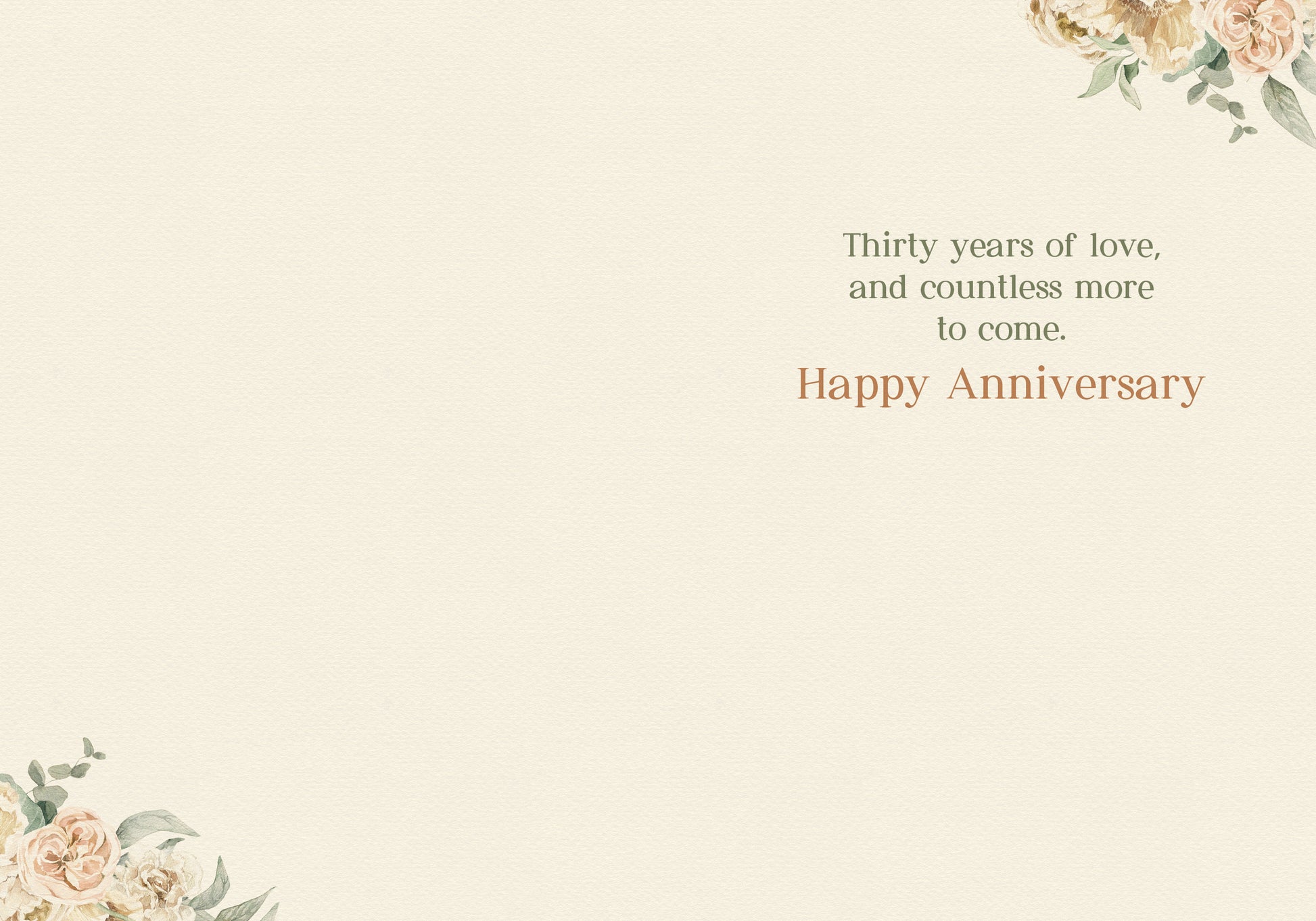 Inside Greeting: Thirty years of love, and countless more to come. Happy Anniversary.