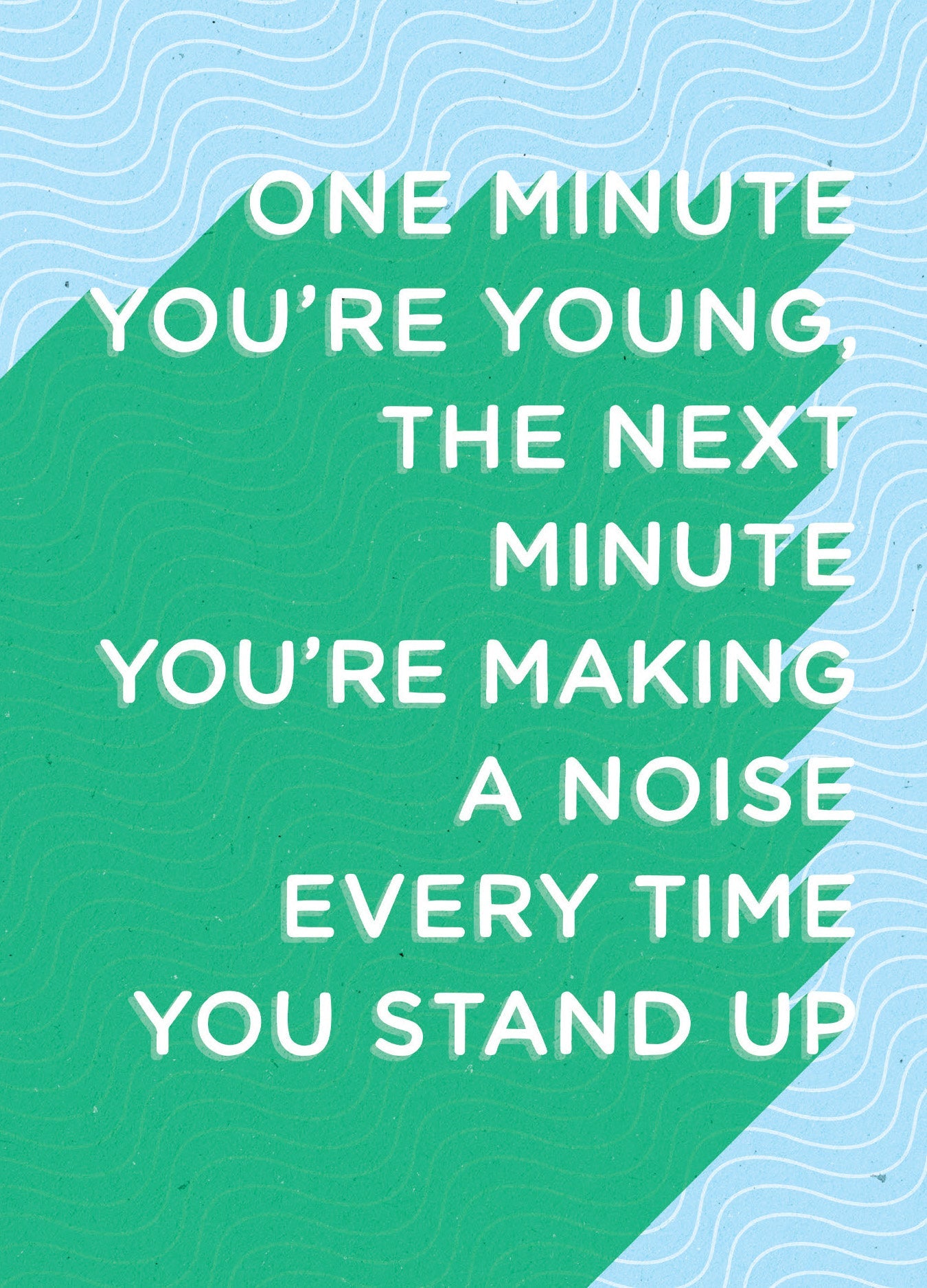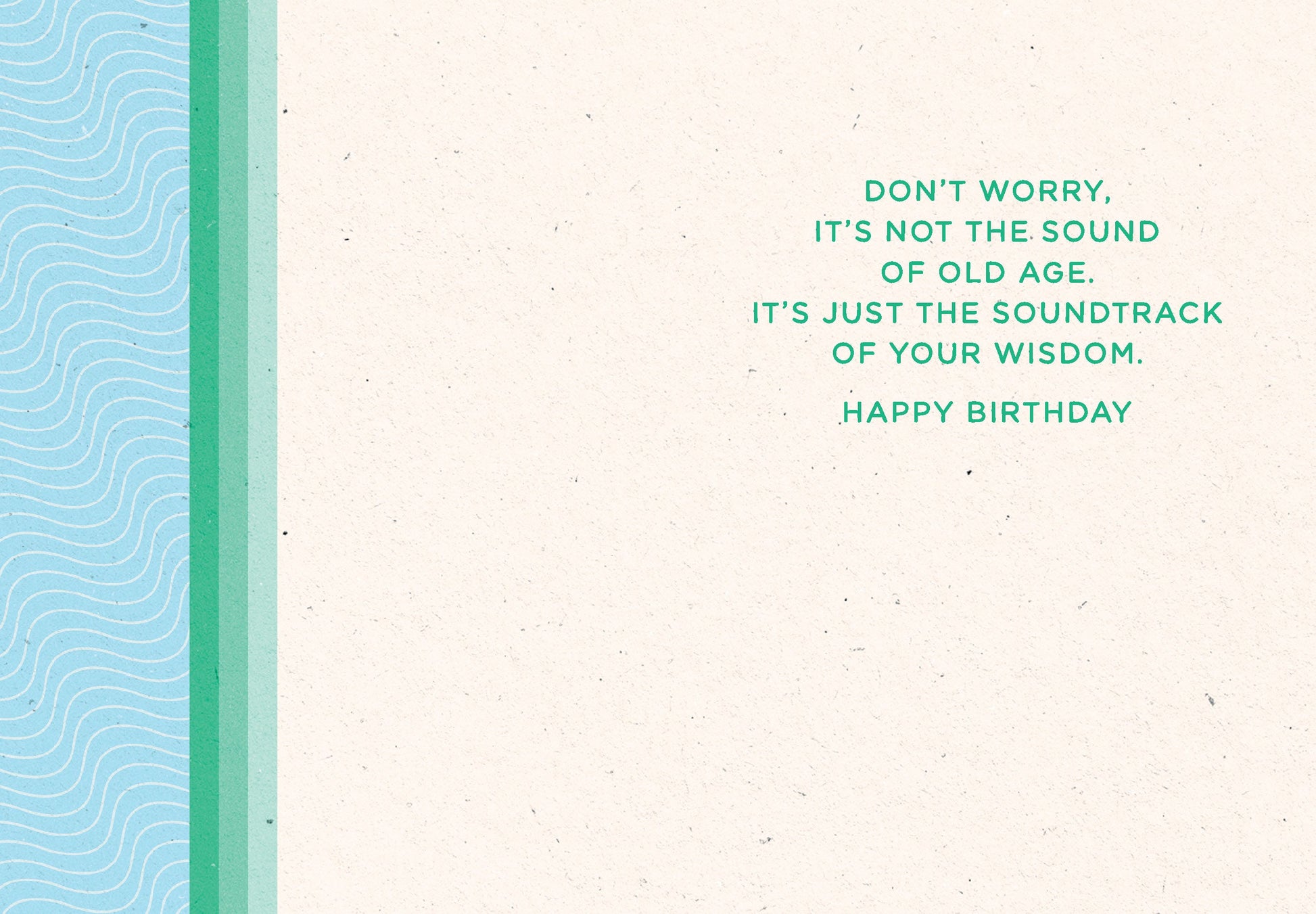 Inside Greeting: Don't worry, it's not the sound of old age. It's just the soundtrack of your wisdom. Happy Birthday.