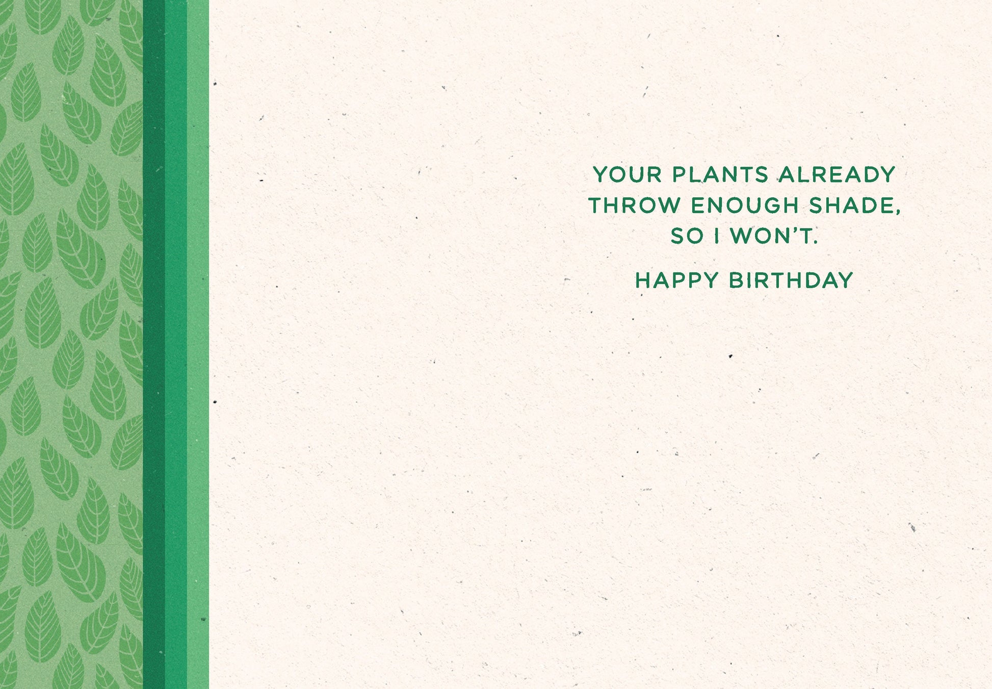 Inside Greeting: Your plants already throw enough shade, so I won't. Happy Birthday.