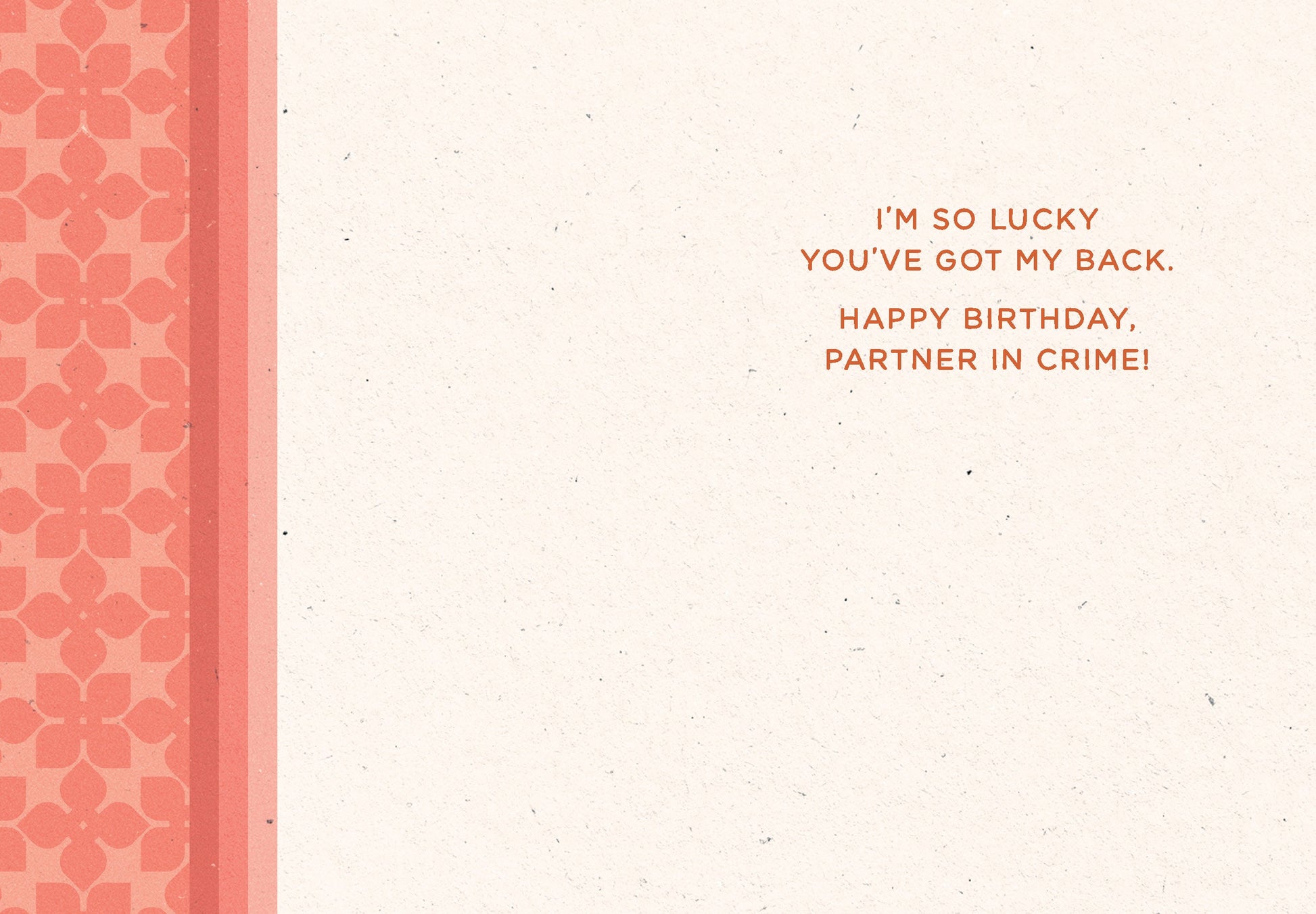 Inside Greeting: I'm so lucky you've got my back. Happy birthday, partner in crime!