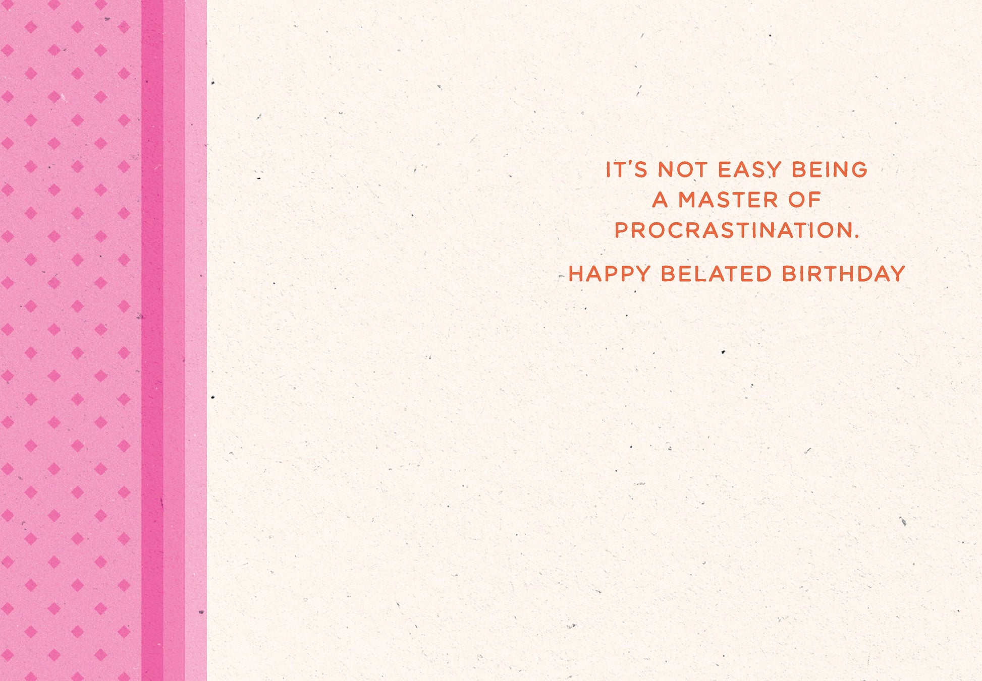 Inside Greeting: It's not easy being a master of procrastination. Happy Belated Birthday.