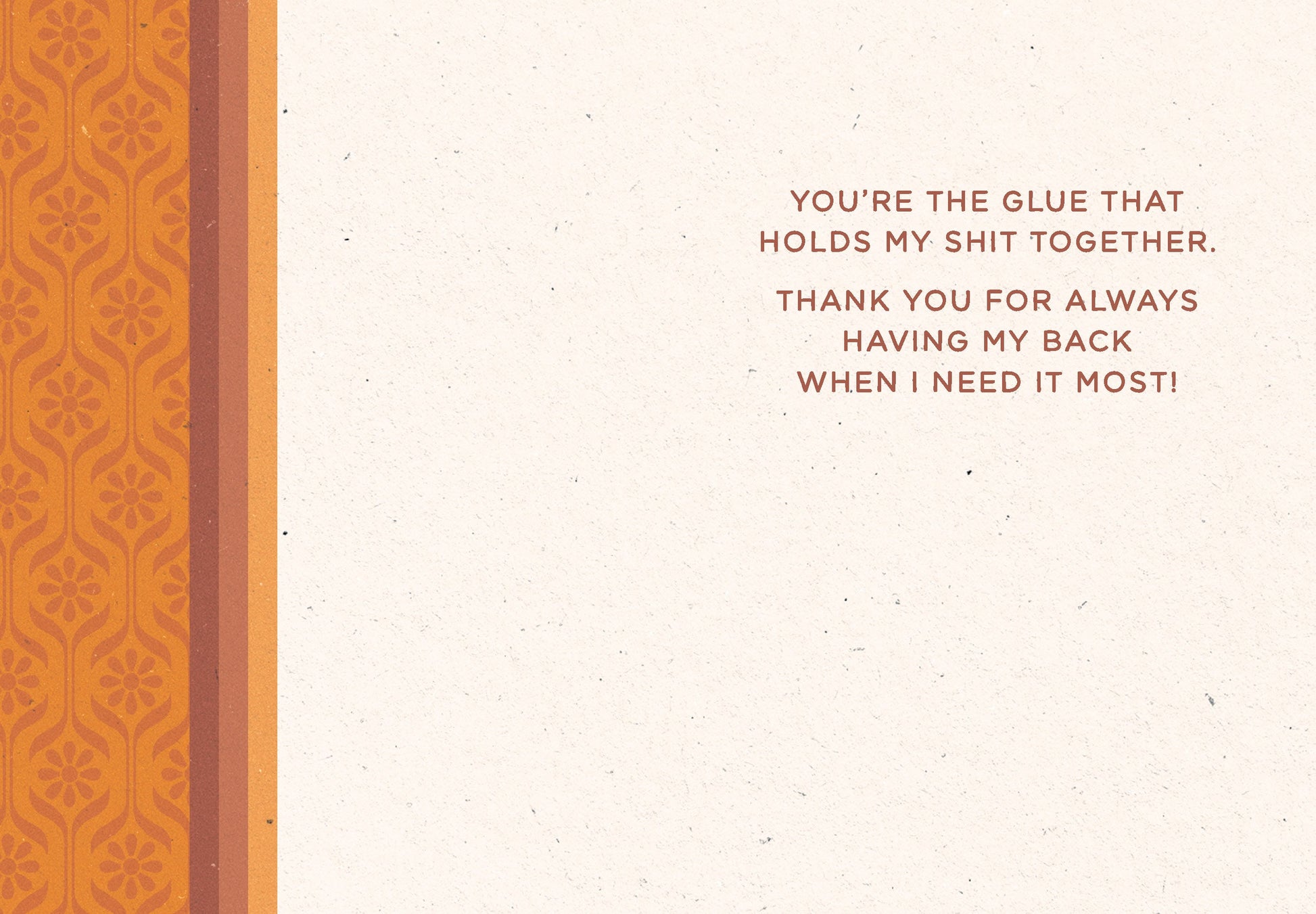 Inside Greeting: You're the glue that holds my shit together. Thank you for always having my back when I need it most!