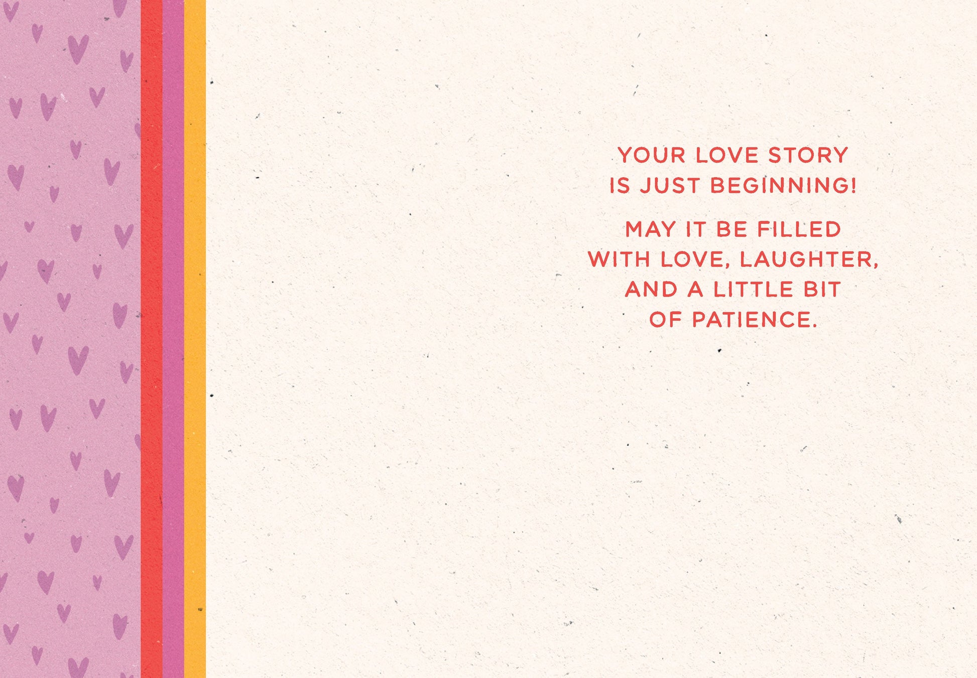 Inside Greeting: Your love story is just beginning! May it be filled with love, laughter, and a little bit of patience.
