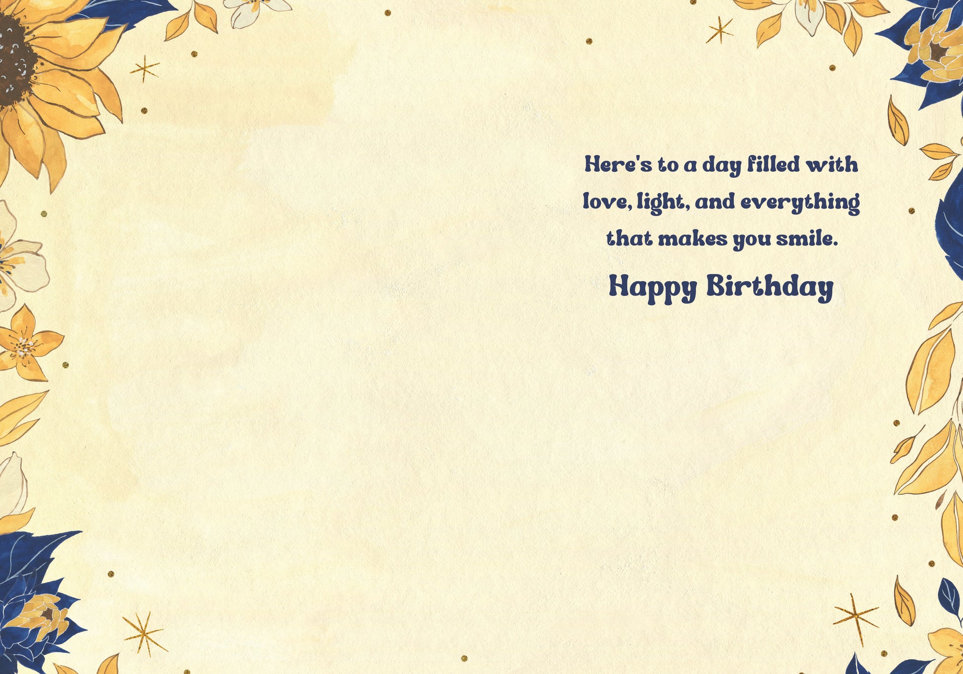 Inside Greeting: Here's to a day filled with love, light, and everything that makes you smile. Happy Birthday