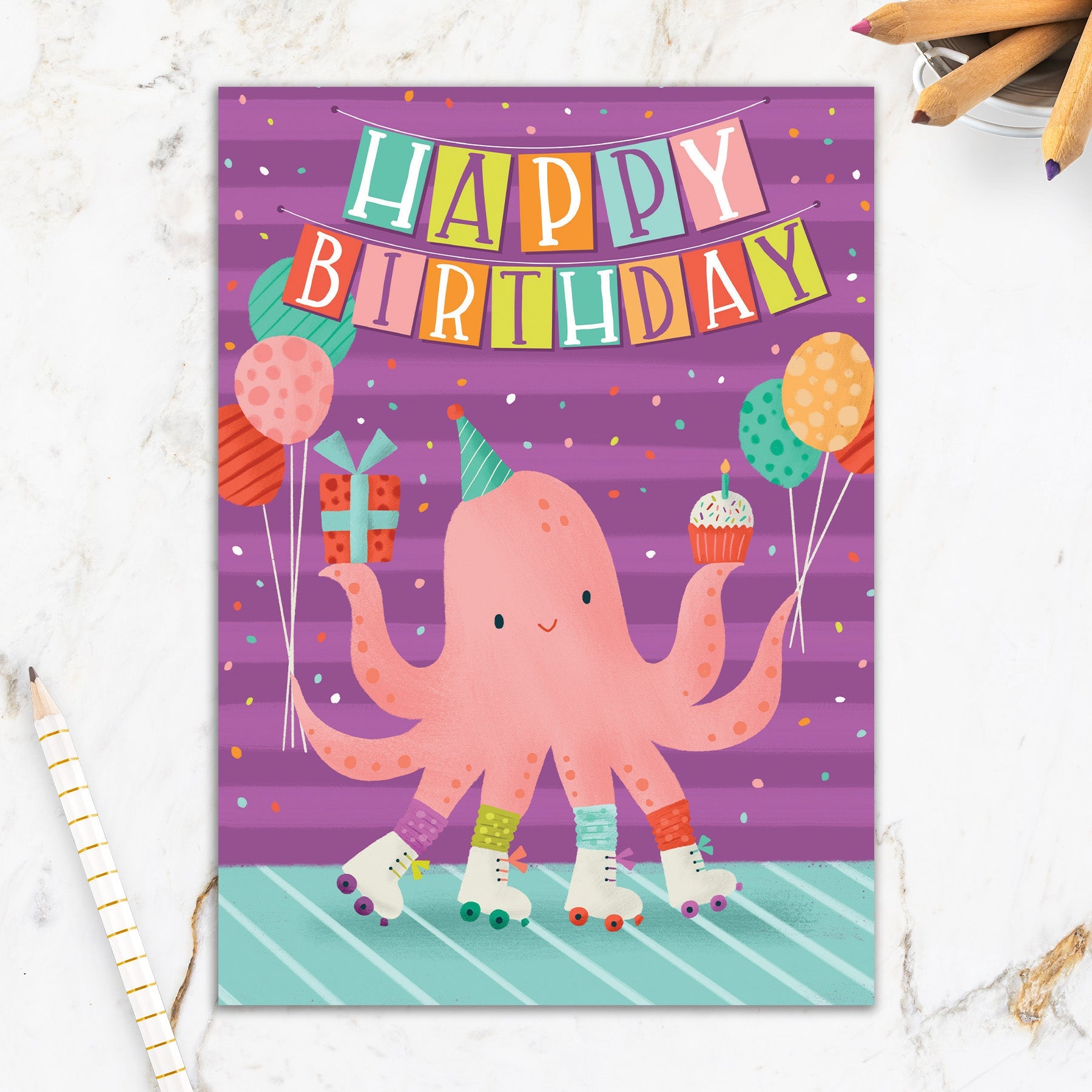 This greeting card measures 5" x 7" and comes with a coordinating colorful envelope.