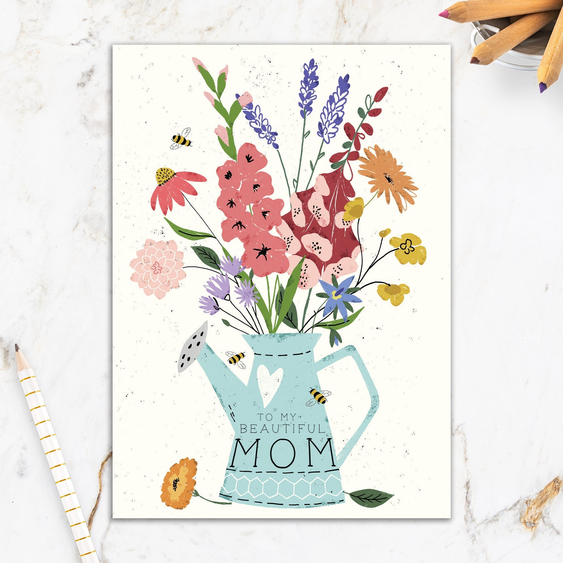 This greeting card measures 5" x 7" and comes with a coordinating colorful envelope.