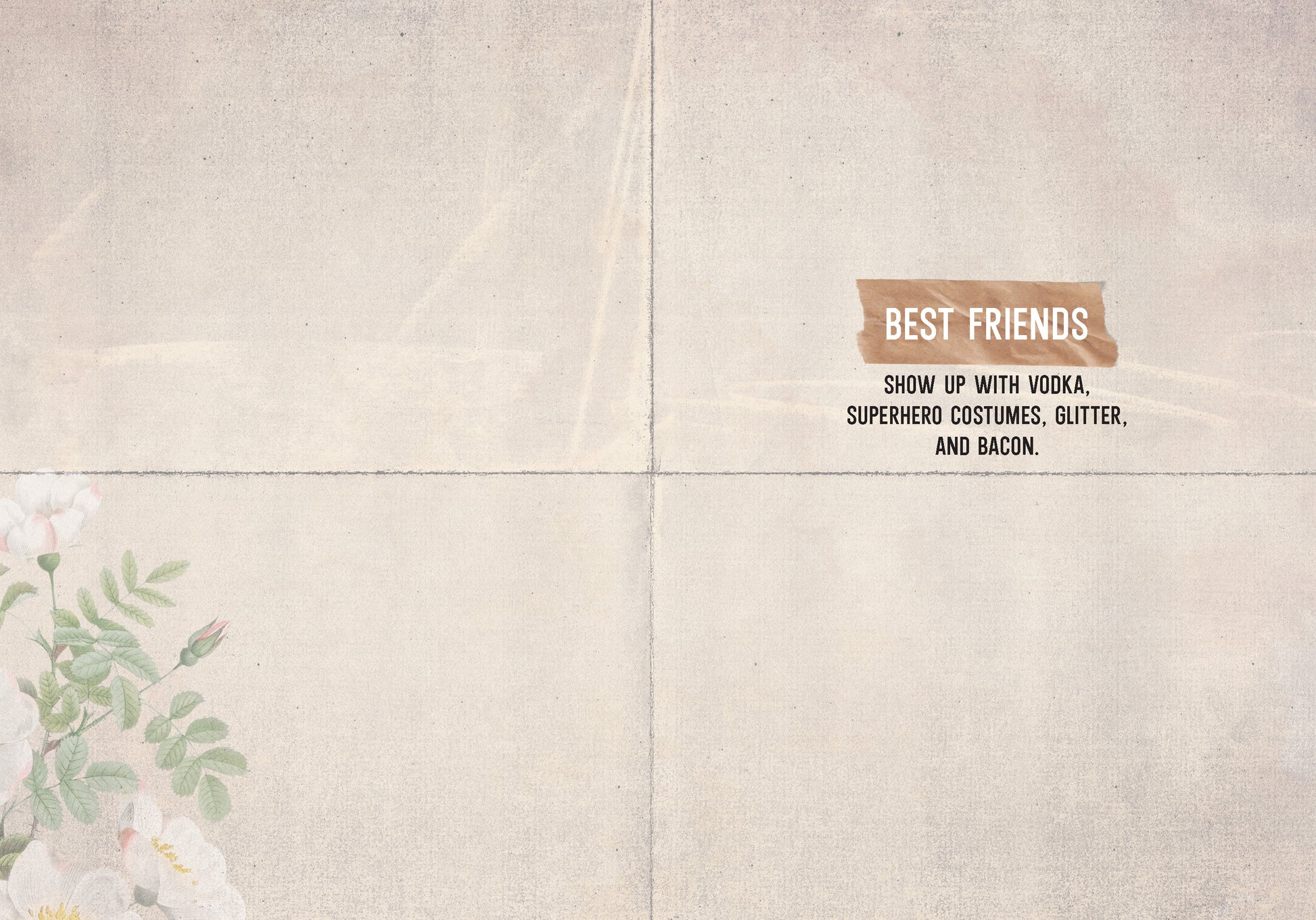 Inside Greeting: Best friends show up with vodka, superhero costumes, glitter, and bacon.