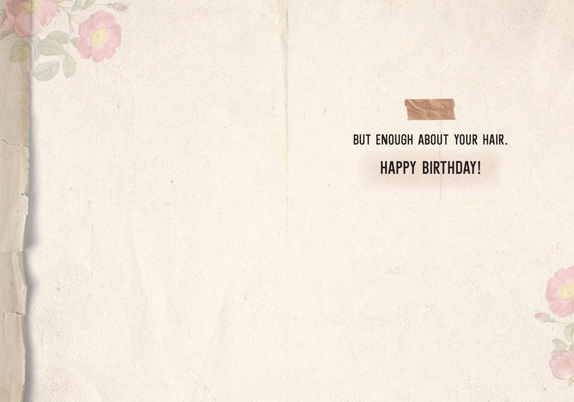 Inside Greeting: But enough about your hair. Happy Birthday!