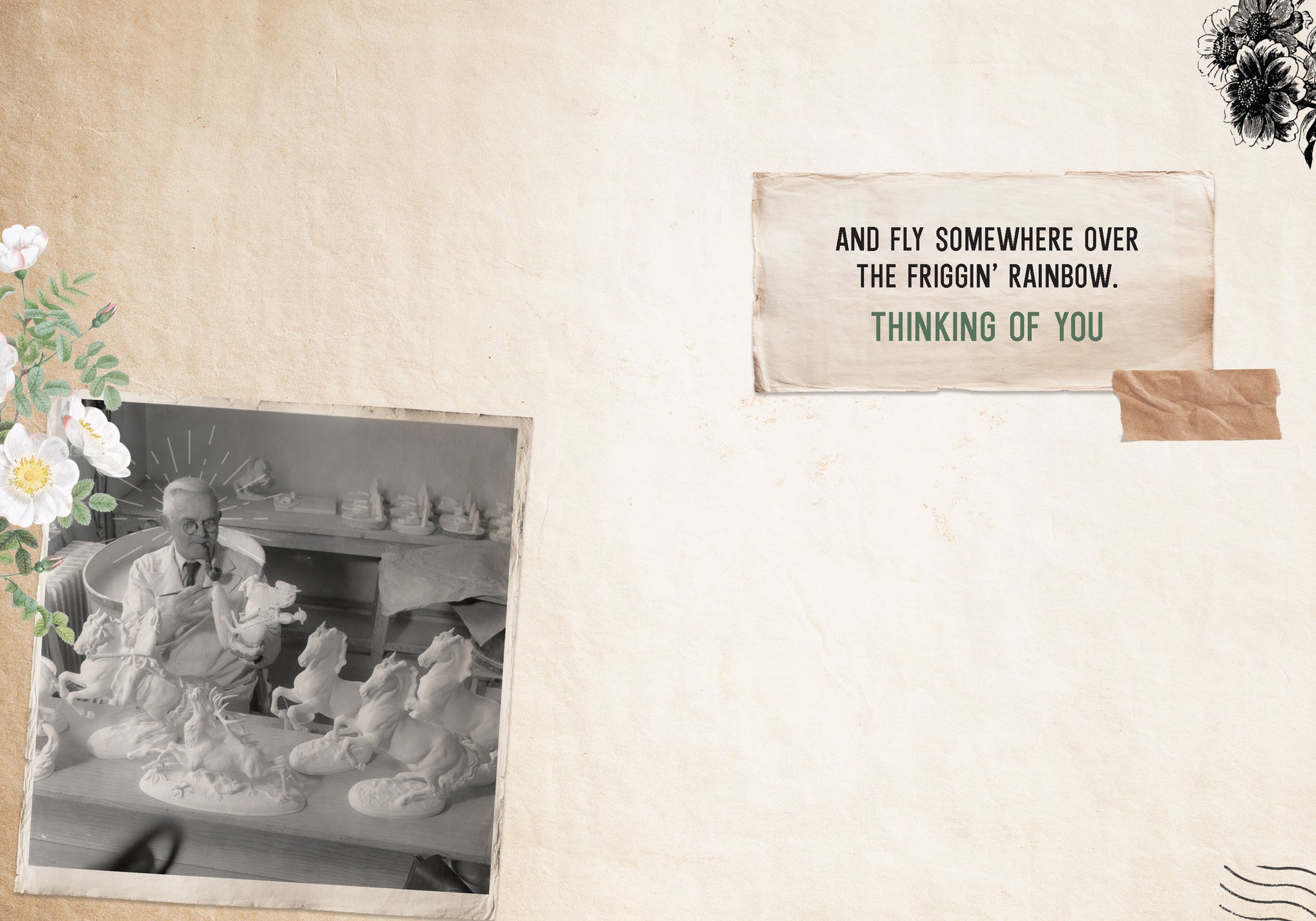 Inside Greeting: And fly somewhere over the friggin' rainbow. Thinking of You.