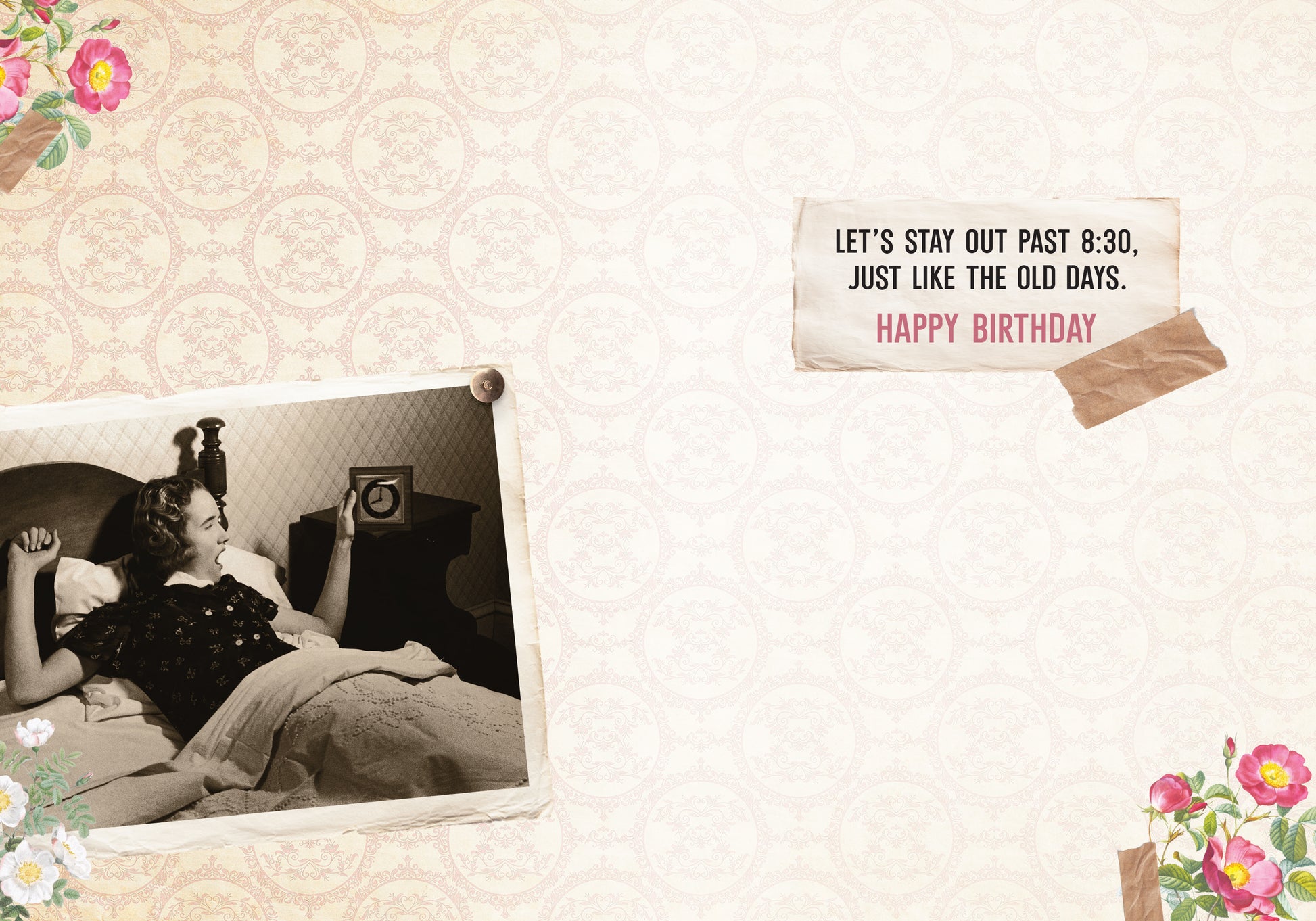 Inside Greeting: Let's stay out past 8:30, just like the old days. Happy Birthday.
