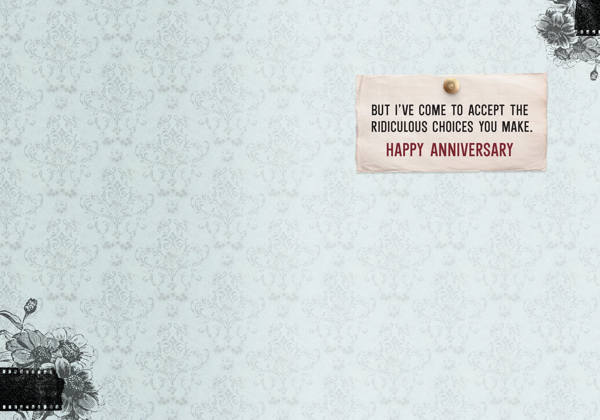Inside Greeting: but I've come to accept the ridiculous choices you make. Happy Anniversary.