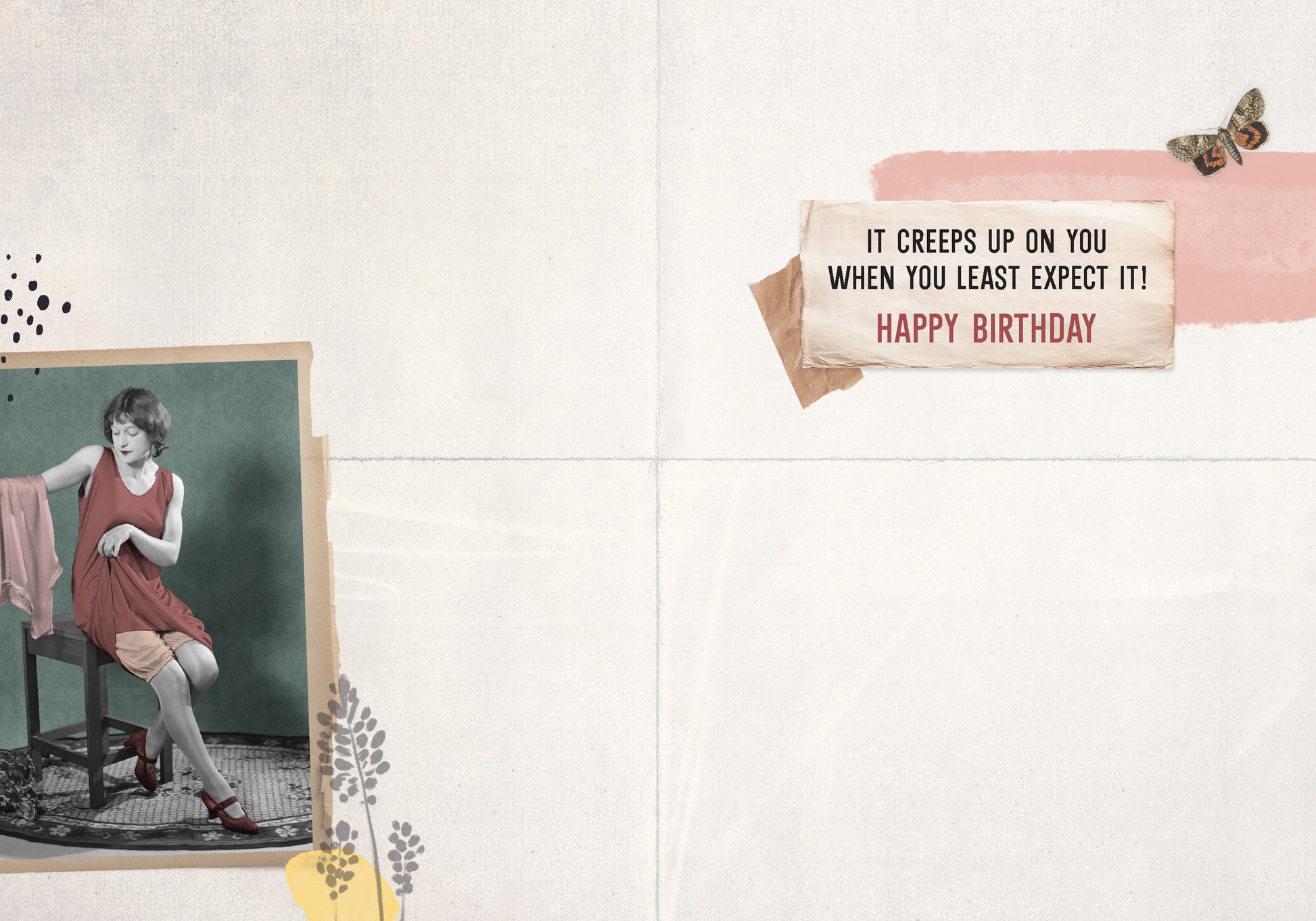 Inside Greeting: it creeps up on you when you least expect it! Happy Birthday.