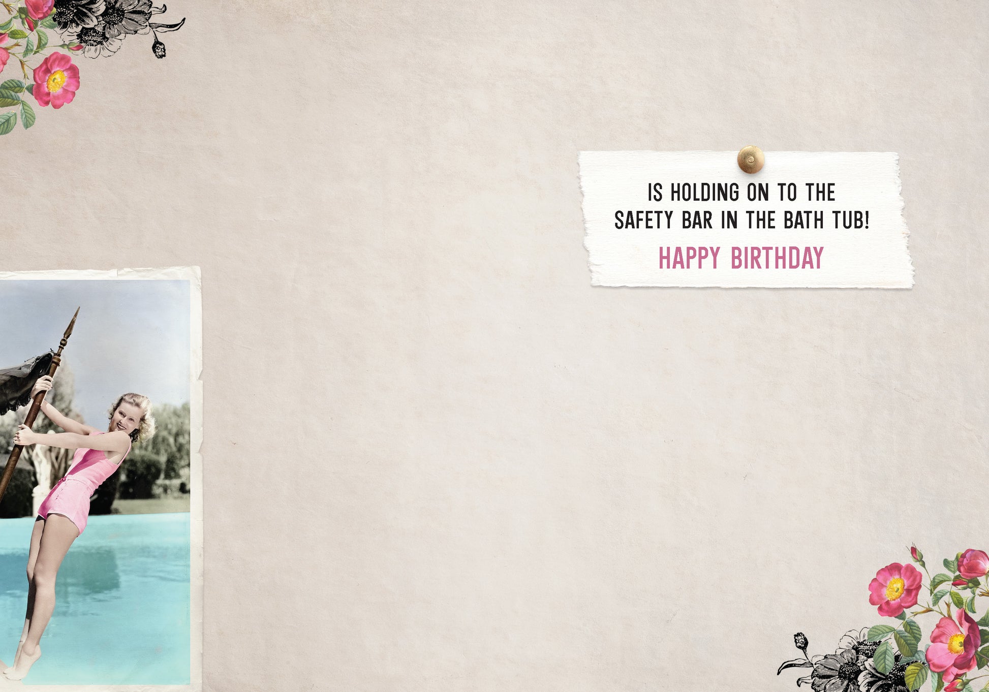 Inside Greeting: is holding on to the safety bar in the bath tub! Happy Birthday.