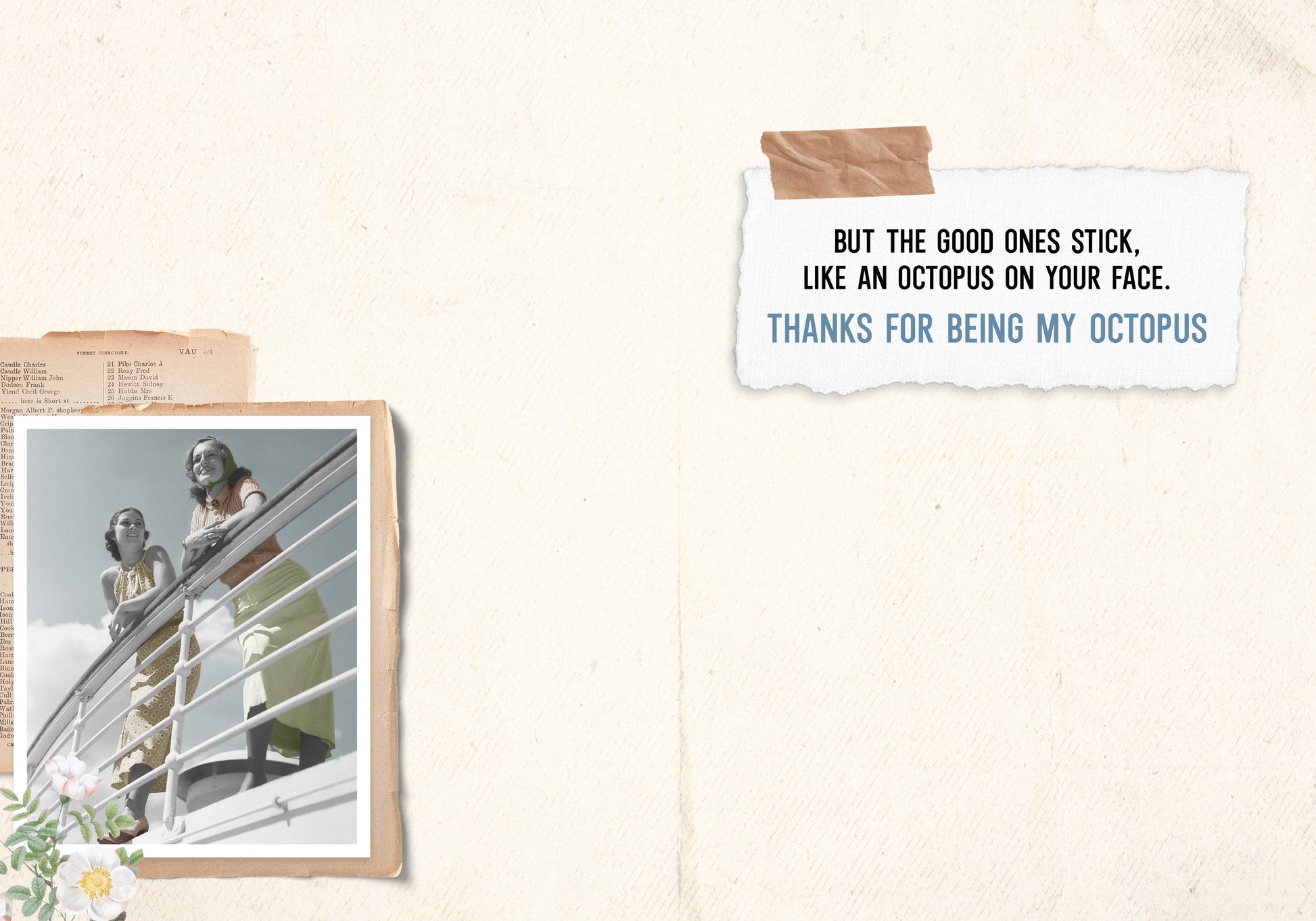Inside Greeting: but the good ones stick, like an octopus on your face. Thanks for being my octopus.